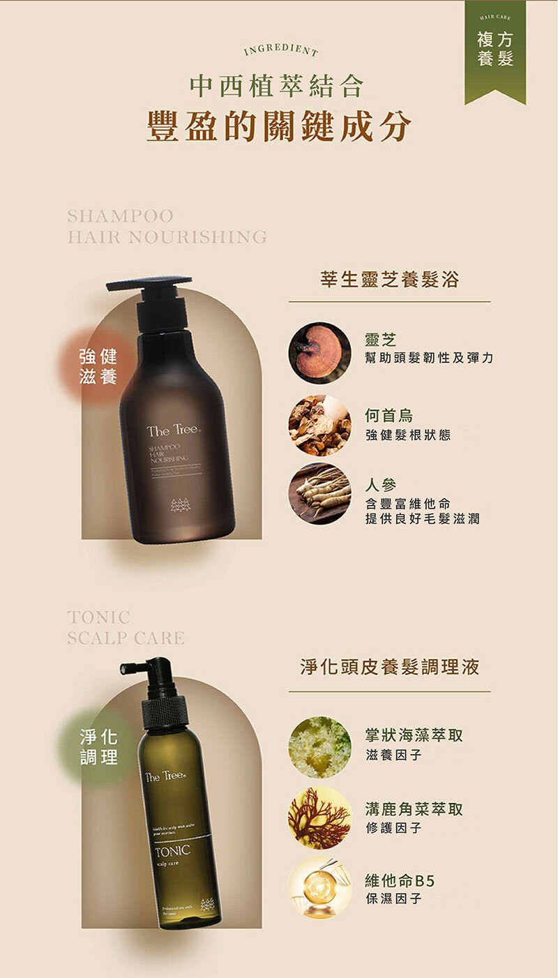 針對有脆弱髮絲困擾族群下去為考量設計,選用中西合併多種溫和的植萃營養成分;添加了靈芝萃取液、人蔘根萃取液、何首烏萃取液、小球藻萃取等的多種珍貴植物精華,導入營養並強健髮根,維護頭皮的健康,使頭髮富有韌性與彈力。