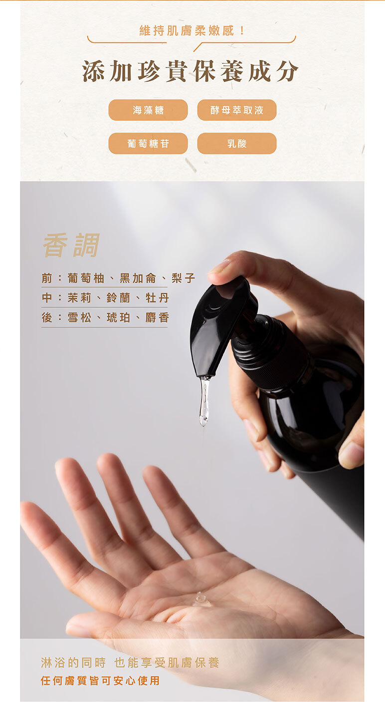 溫和清潔肌膚,提升肌膚柔嫩感,泡沫綿密,洗完之後肌膚柔嫩不乾澀,雪松與琥珀融合的香調讓人洗完之後心情愉悅放鬆。