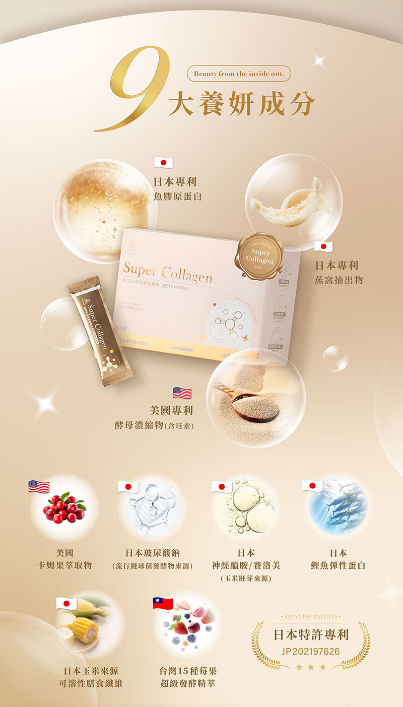 成分:魚膠原胜肽、蔓越莓果汁粉(砂糖、麥芽糊精、蔓越莓濃縮汁、香料、檸檬酸、檸檬酸鈉、紅甜菜汁、婀娜多色素、梔子藍色素)、難消化性麥芽糊精、檸檬酸、卡姆果萃取物(卡姆果萃取物、麥芽糊精、維他命C)、超級莓果發酵精萃(樹薯來源難消化性麥芽糊精、樹薯來源麥芽糊精、綜合莓果發酵物(接骨木莓、野櫻莓、巴西莓、山桑子、黑醋栗、覆盆莓、黑莓、藍莓、波森莓、蔓越莓、楊梅、枸杞、余甘子、草莓、桑椹))、專利日本燕窩萃取物(含燕窩酸)(糊精、燕窩萃取物)、專利美國酵母萃取物(含硅素)、日本鰹魚彈力蛋白、流行鏈球菌發酵物(含透明質酸鈉)、玉米胚芽抽出物(含神經醯胺)