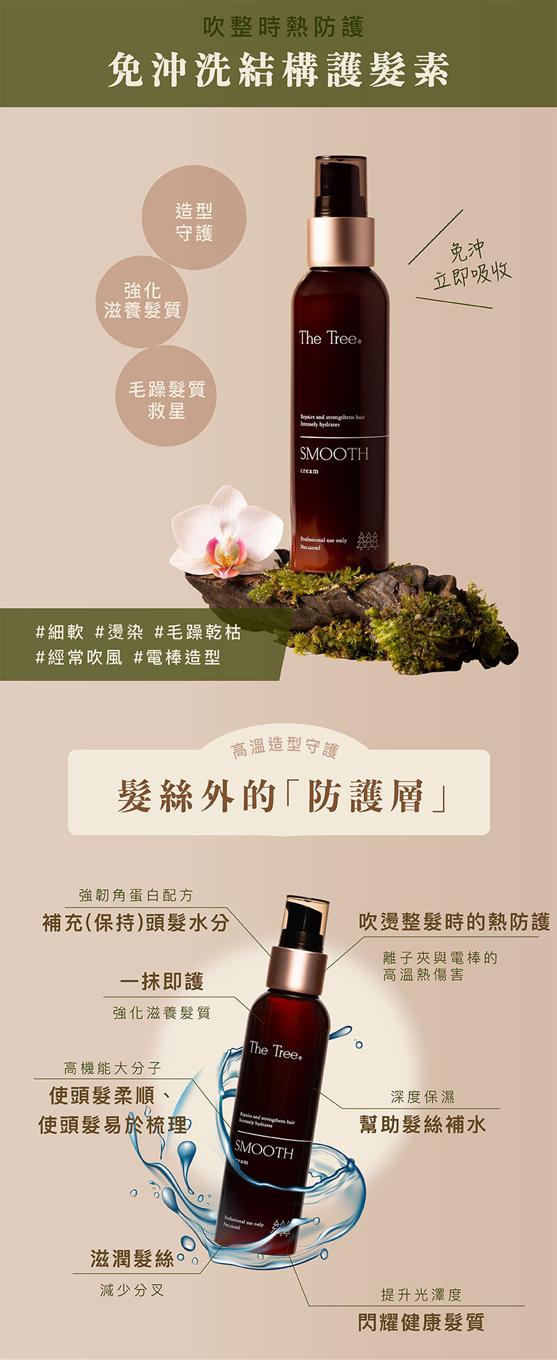免沖洗,吹整前使用,有效抗熱功效。洗髮後,乾濕皆可使用,取本品少量均勻抹於髮絲上,用寬版梳將頭髮梳開即可進行吹風造型,吹直、烘捲。