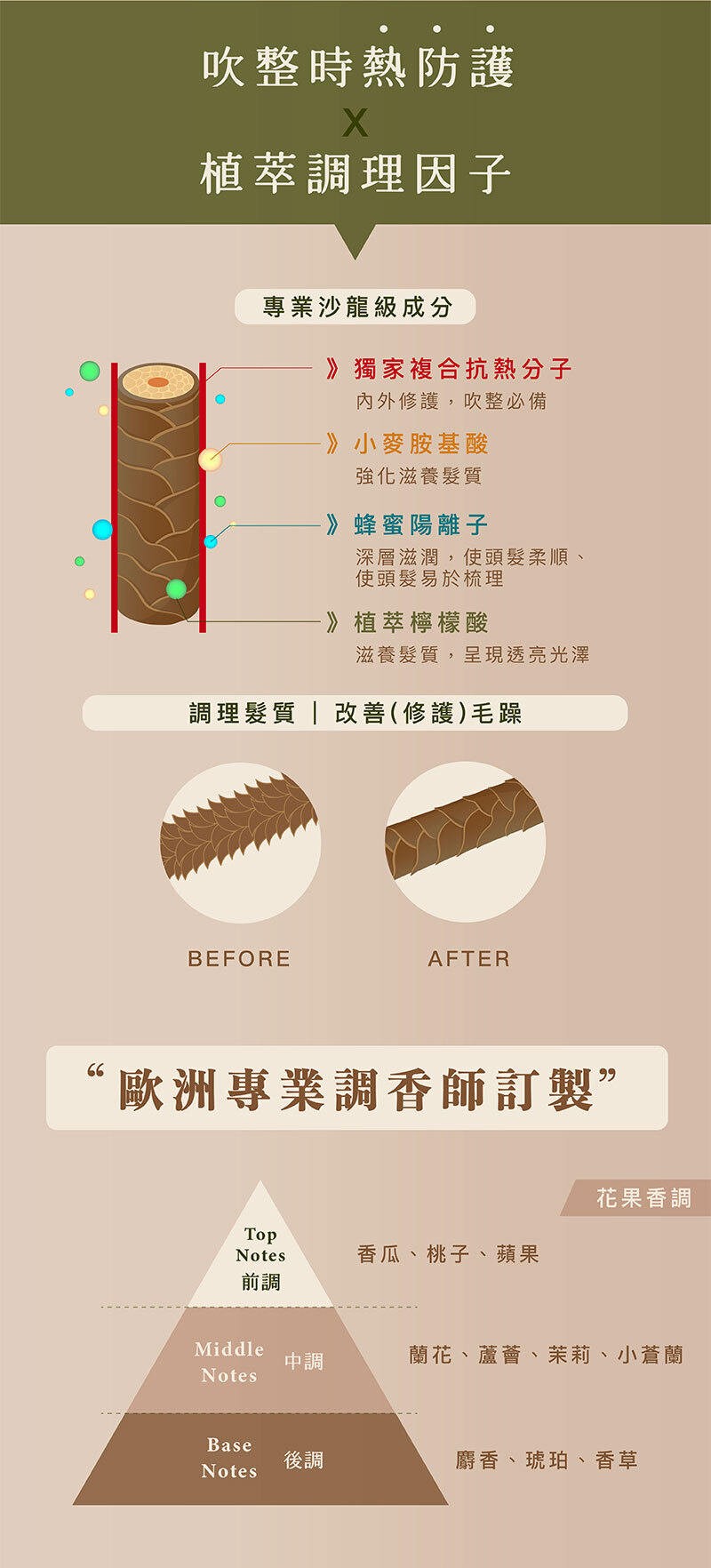 髮絲外層保護膜,修護毛躁髮質,使髮絲有彈性、防止髮絲斷裂。