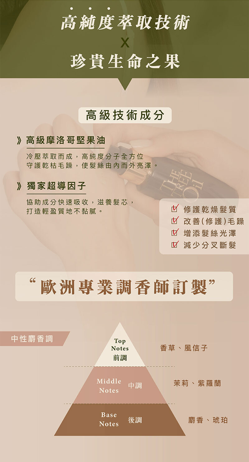 超輕盈不油膩的滋養配方,質地輕盈,荷蘭植萃堅果油,不加一滴水,冷壓萃取技術,使秀髮柔軟卻不致扁塌厚重。