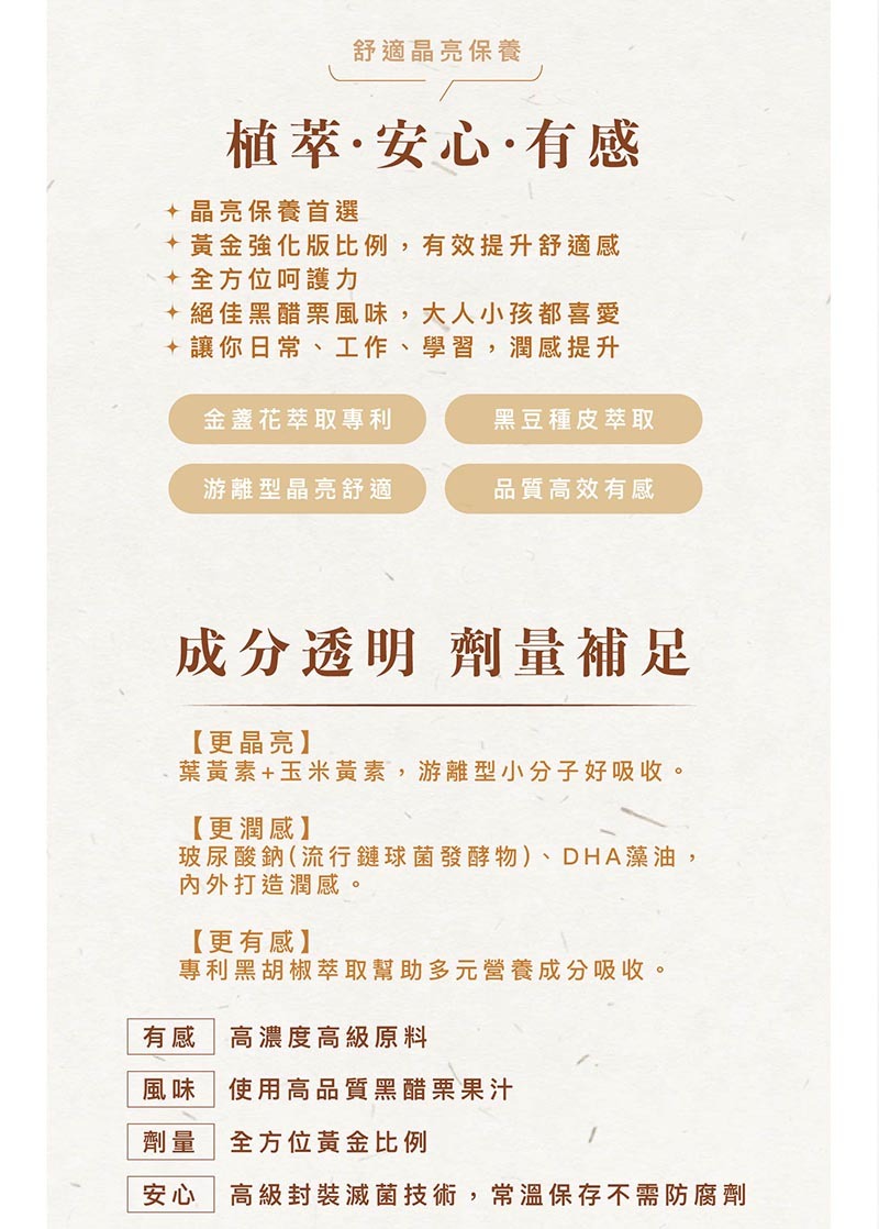 6. 打造內外平衡舒適感(玻尿酸鈉、DHA藻油),促新陳代謝(黑豆種皮、山桑子含花青素),全方位呵護晶亮。