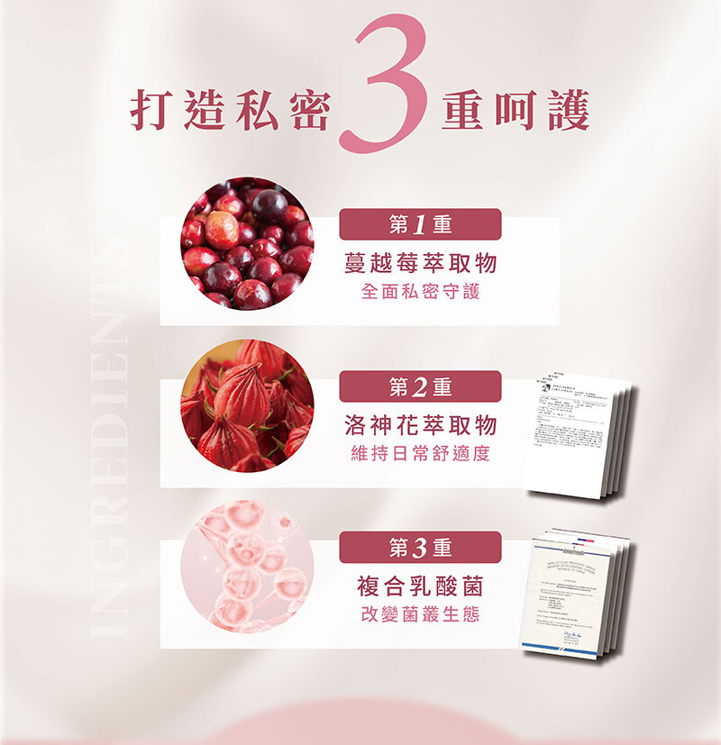 成分:蔓越莓果汁粉(砂糖、麥芽糊精、蔓越莓濃縮汁、香料、檸檬酸、檸檬酸鈉、紅甜菜汁、婀娜多色素、梔子藍色素)、麥芽糖醇(甜味劑)、麥芽糊精(麥芽糊精、羧甲基纖維素鈉)、蔓越莓萃取、洛神花萃取(洛神花萃取、麥芽糊精)、乳酸菌粉【乳酸菌粉(瑞士乳桿菌Lactobacillus helveticus LA25、乳酸乳桿菌Lactobacillus delbrueckii ssp. lactis LDL114)、植物乳桿菌Lactobacillus plantarum LP115、發酵乳桿菌Lactobacillus fermentum LF26、鼠李糖乳桿菌Lactobacillus rhamnosus LRH10、副乾酪乳桿菌Lactobacillus paracasei LPC12)、麥芽糊精、微結晶狀α-纖維素】、蔓越莓萃取(蔓越莓萃取、麥芽糊精)、香料、二氧化矽、蔗糖素(甜味劑)