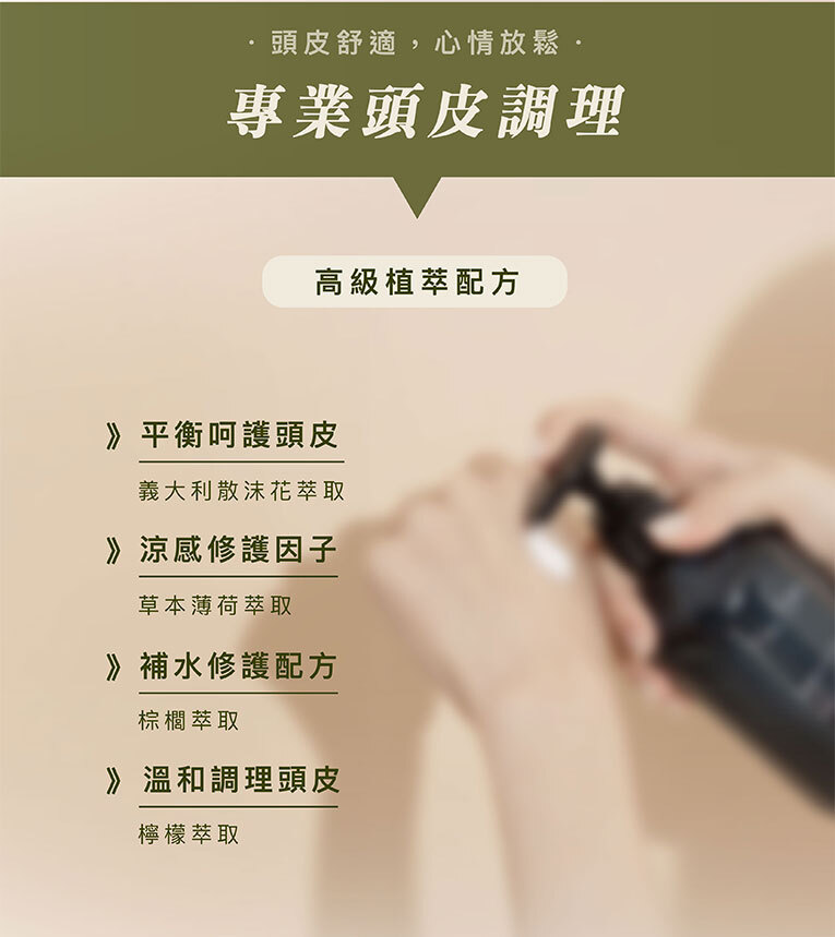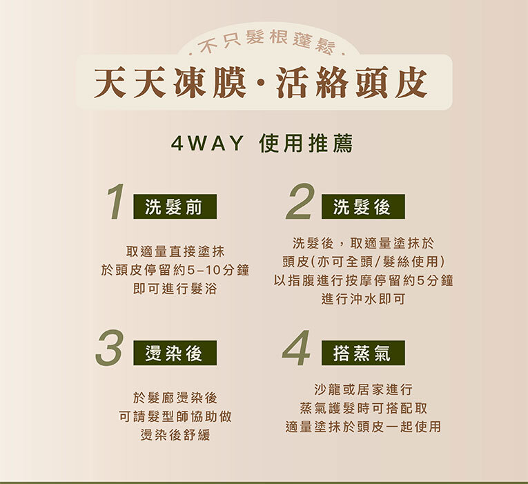 使用頭皮調理凍膜按摩頭皮後,可調理頭皮與毛髮,幫助放鬆、清涼舒緩感頭皮,讓頭髮充滿活力、柔順有光澤。