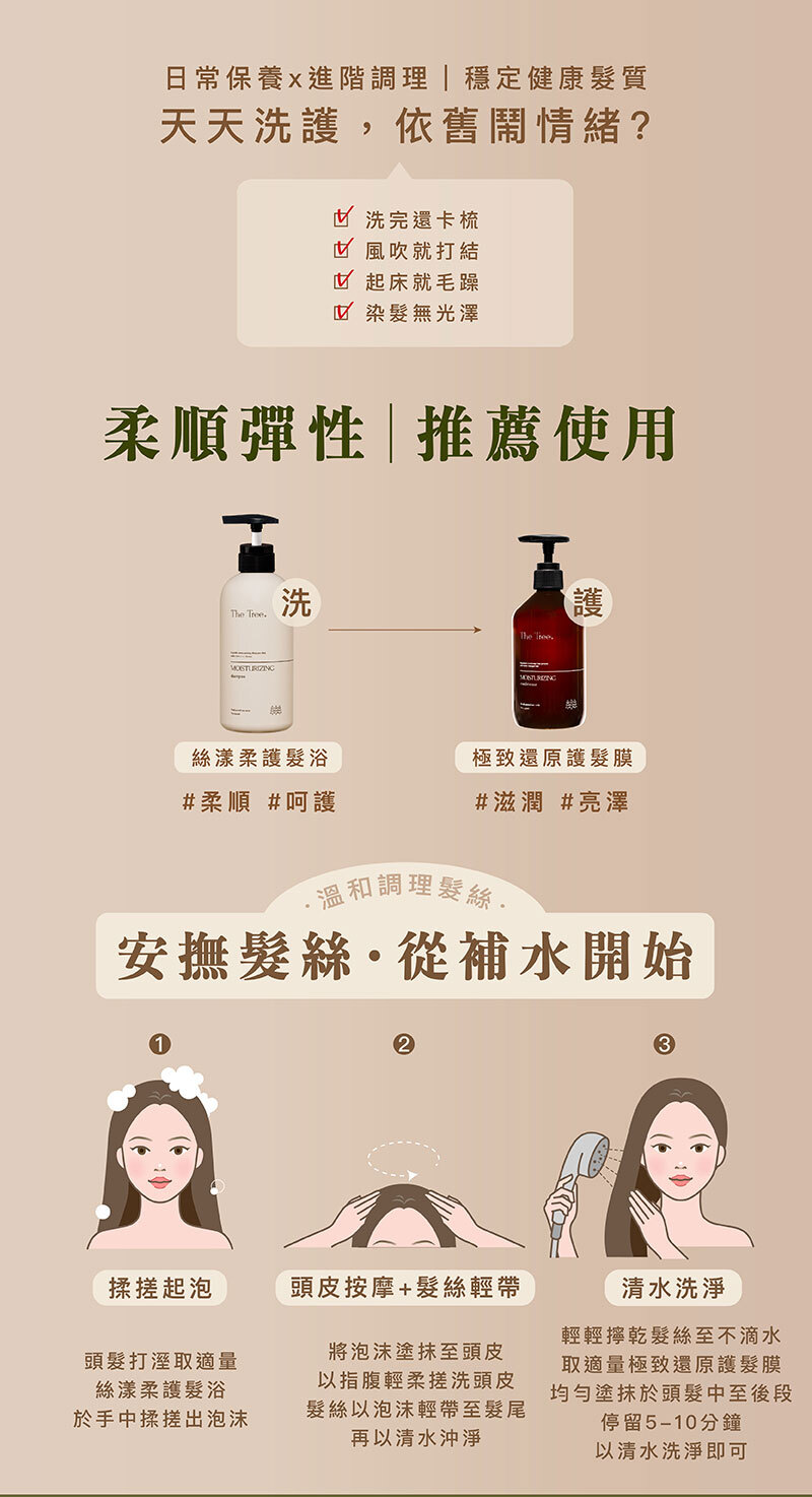 洗髮後,取適量護髮膜均勻塗抹於頭髮上,停留 3 - 5 分鐘後,清水沖淨即可 (沖水時水溫不要太熱,切勿塗膜至頭皮)。