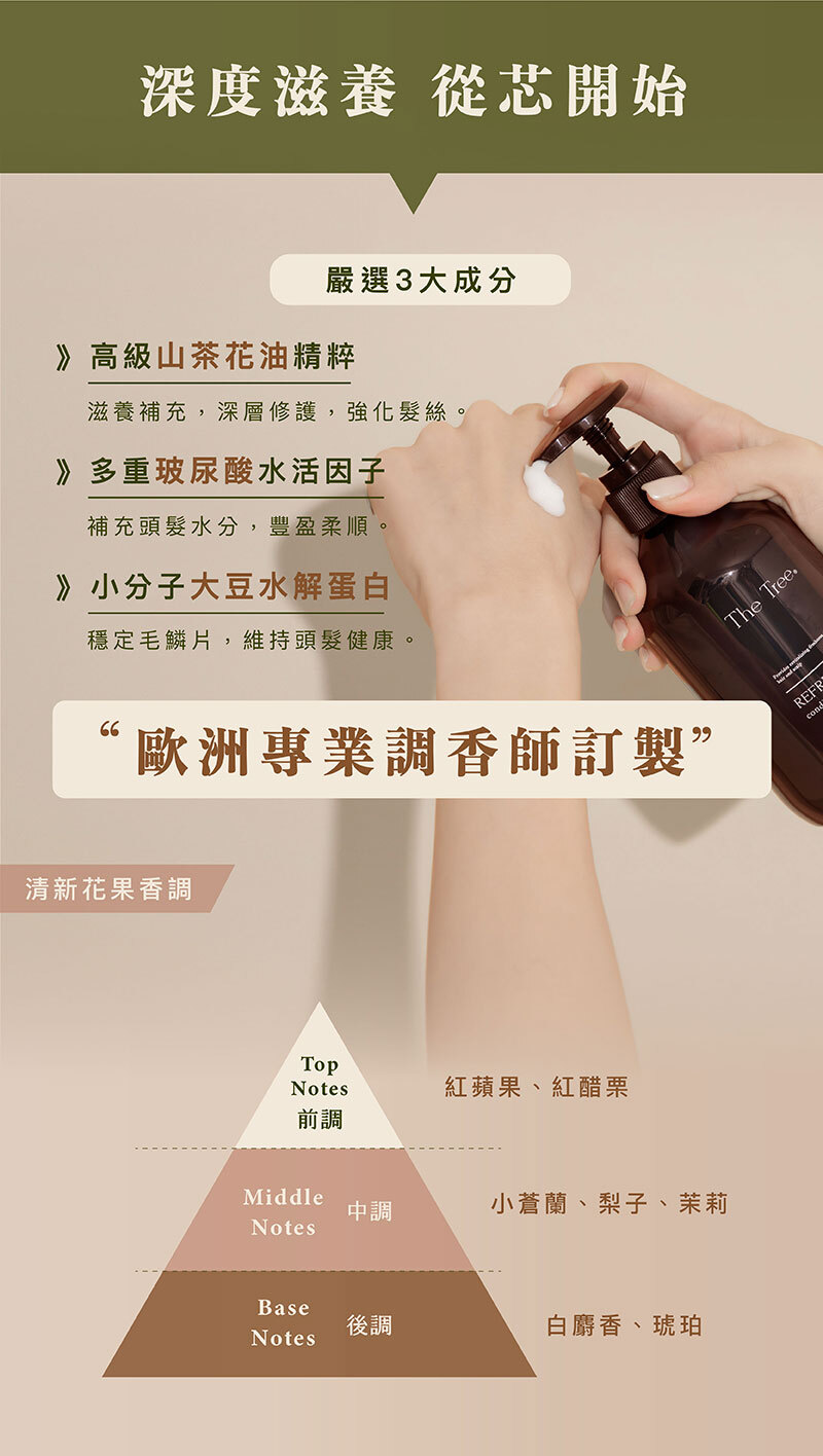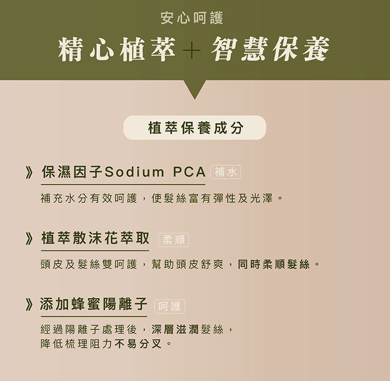 提供溫和的清潔力及呵護髮絲的營養,提升頭髮柔潤與光澤。
