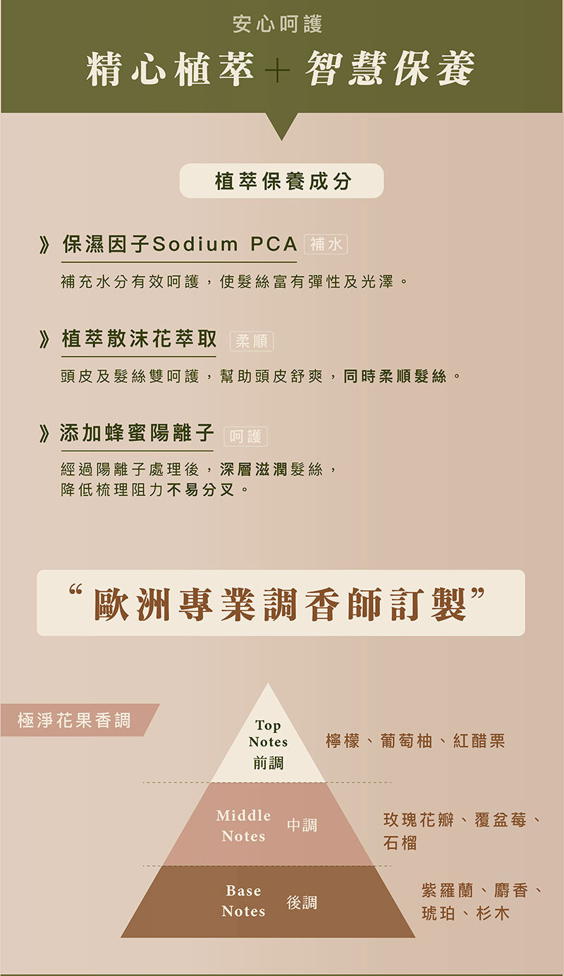 主要成分:蜂蜜陽離子、小麥胺基酸、植萃檸檬酸