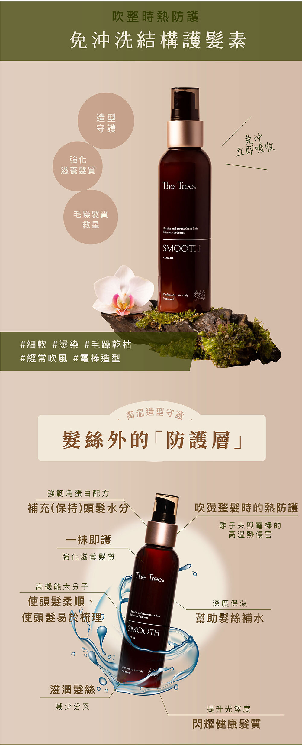 免沖洗,吹整前使用,有效抗熱功效。洗髮後,乾濕皆可使用,取本品少量均勻抹於髮絲上,用寬版梳將頭髮梳開即可進行吹風造型,吹直、烘捲。