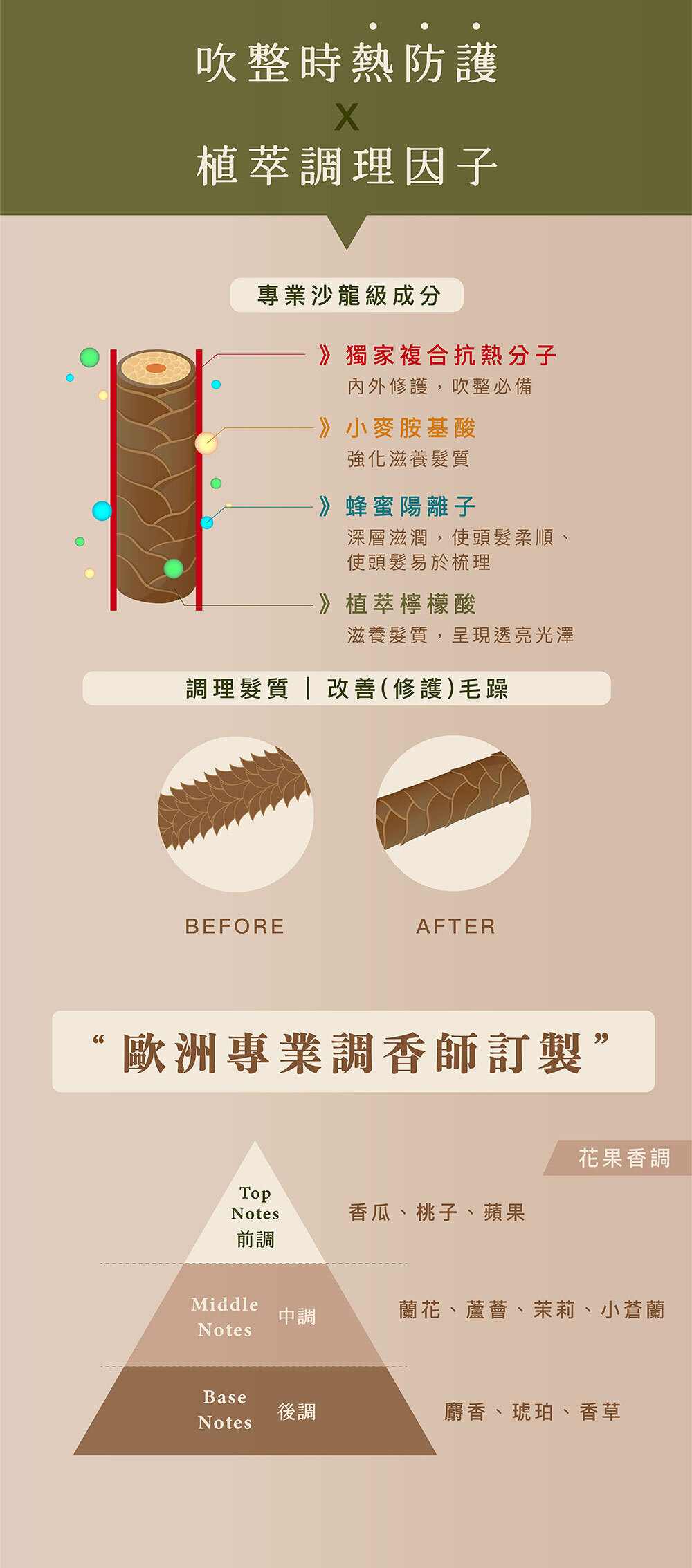 髮絲外層保護膜,修護毛躁髮質,使髮絲有彈性、防止髮絲斷裂。