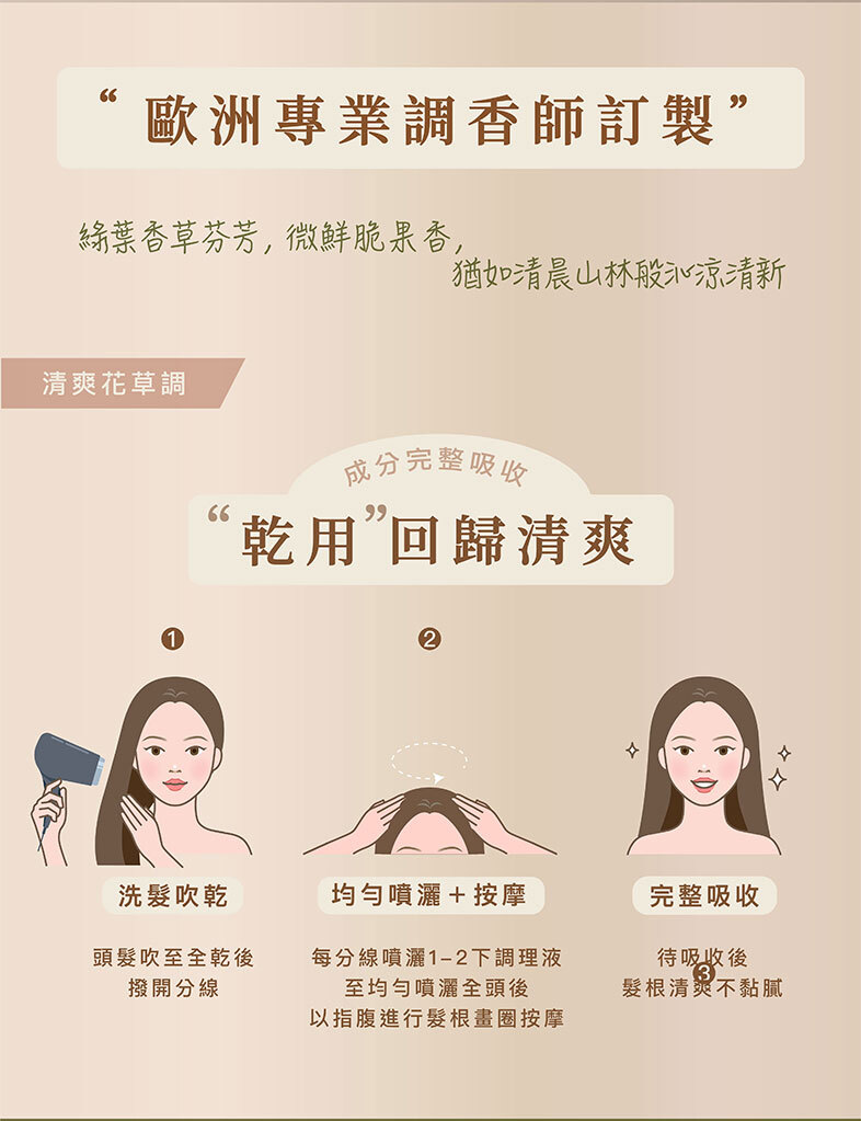 洗髮後,先將頭皮吹乾,將本產品貼近於頭皮髮根分線處噴灑。每條分線噴1-2下,均勻噴灑全頭並按摩吸收即可。